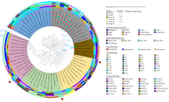 Based on the complete genome sequences of 64 V. parahaemolyticus strains, together with the V. parahaemolyticus B2-28, N9-20, and N2-5 genomes obtained in this study, approximately 1291 homologous single-copy amino acid sequences were identified, by which a phylogenetic tree was constructed (Figure 2). Among the strains analyzed, some were isolated from humans (n = 20), the environment (n = 7), aquatic animals (n = 28), and unknown sources (n = 12) from 1951 to 2021 in Asia, Europe, and the Americas (Table S5). The phylogenetic analysis unveiled four distinct groups, namely Groups 1 to 4. Groups 3 and 4 were further subdivided into two subgroups, namely Groups 3a, 3b, 4a, and 4b (Figure 2).