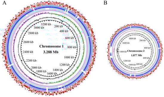 Genome circle maps of the three V. parahaemolyticus isolates. (A,B) represent the larger and smaller chromosomes of the three V. parahaemolyticus isolates, respectively. Circles from the inside to the outside: the GC contents, the GC skew values (positive in purple and negative in green), the reference genome of V. parahaemolyticus RIMD 2210633 (GenBank accession numbers NC_004603.1 and NC_004605.1), the genomes of V. parahaemolyticus B2-28, N9-20, and N2-5, as well as the CDSs (positioned on the positive and negative strands accordingly), respectively.