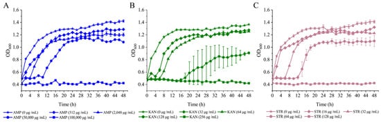 The V. parahaemolyticus isolates were individually inoculated in the TSB medium supplemented with different concentrations of AMP (0 μg/mL, 512 μg/mL, 2048 μg/mL, 50,000 μg/mL, and 100,000 μg/mL, respectively), KAN (0 μg/mL, 32 μg/mL, 64 μg/mL, 128 μg/mL, and 256 μg/mL, respectively), or STR (0 μg/mL, 16 μg/mL, 32 μg/mL, 64 μg/mL, and 128 μg/mL, respectively). Then, the mixture was incubated at 37 °C for 48 h. Bacterial growth was examined using the Bioscreen C automated growth analyzer (Lab Systems, Helsinki, Finland). The standard colony counting method was used to calculate the bacterial survival rates [36].