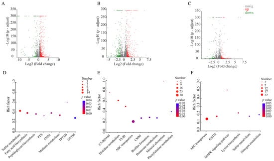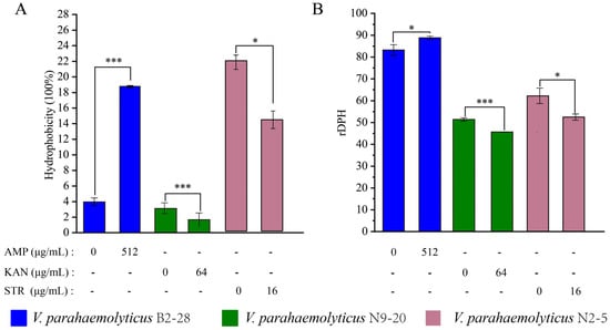 A final concentration of AMP (512 μg/mL), KAN (64 μg/mL), or STR (16 μg/mL) was added into V. parahaemolyticus B2-28, N9-20, and N2-5 culture at the mid-LGP, respectively, and then incubated at 37 °C for 2 h. The bacterial cells were then collected by centrifugation at 12,000 rpm for 2 min. Then, the RNA extraction and quality control processes, as well as the construction of sequencing libraries, were conducted by Shanghai Majorbio Bio-pharm Technology Co., Ltd. in Shanghai, China using the Illumina HiSeq 2500 platform (Illumina, Santiago, CA, USA). To ensure data accuracy, three replicates were performed for every sample.