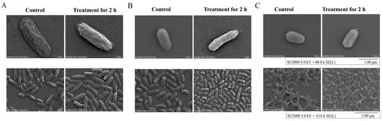 The SEM assay was conducted in accordance with the previously described technique [37]. Briefly, the sub-LC of AMP (512 μg/mL), KAN (64 μg/mL), or STR (16 μg/mL) was added into V. parahaemolyticus B2-28, N9-20, and N2-5 culture at the mid-LGP, respectively. The mixture was incubated at 37 °C for 2 h. An amount of 1.5 mL of each mixture was then collected, washed, dehydrated, dried, and gold-coated through cathodic spraying. Finally, the samples were observed using a thermal field emission SEM (Hitachi, SU5000, Tokyo, Japan) with accelerating voltages ranging from 5 to 10 kV.