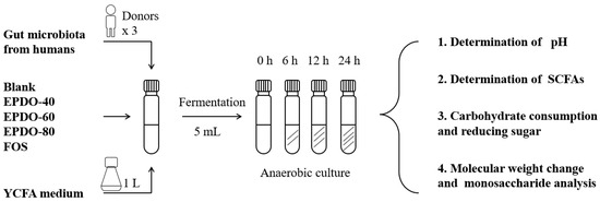 The process of fermentation in vitro is shown in Figure 1, according to the reported method [9]. A 1 mL quantity of fecal inoculum, 4 mL large intestinal simulated fermentation fluid, and 40 mg EPDOs were mixed. Each sample was divided into four groups for 0, 6, 12, and 24 h, fermented at 37 °C. All samples were collected for analysis or kept at −80 °C for subsequent experiments. Oligofructose (FOS) of 8 mg/mL was set as the positive group, and carbon source as the blank.