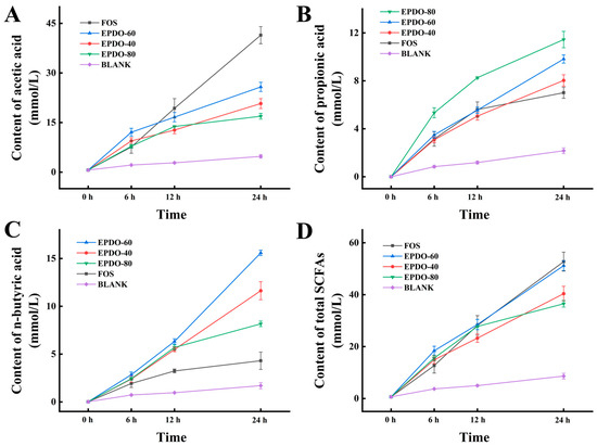 Production of SCFAs including the acetic acid (A), propionic acid (B), n-butyric acid (C), and total SCFAs (D) in EPDOs, FOS and blank groups from 0 to 24 h of fermentation.