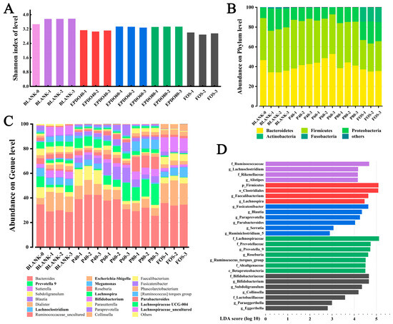 The diversity of the communities was calculated by measuring Shannon’s index as shown in Figure 8A, which accounts for both species’ richness and evenness. This indicates that gut microbiota in both EPDOs and FOS groups showed a trend of decline, while the species of gut microbiota increased significantly when no carbon source was given.