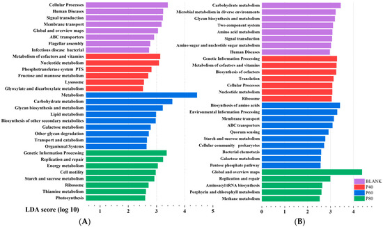 After filtering, KEGG analysis was performed on the eight genera based on their differential abundance in the P40, P60, and P80 groups. It was found that the BLANK group exhibited predominantly metabolism-related functions, while the P40 group showed significant differences in genetic information processing. The P60 group not only had differences in metabolism-related functions but also exhibited membrane transport and cellular processes. The P80 group showed replication and repair. Figure 9B demonstrated significant differences compared to the previous unfiltered KEGG analysis.