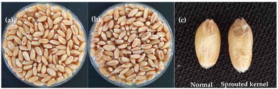 Exterior kernel color changes in the (a) control group and (b) wetted group. Despite the absence of a significant decrease in grain yield, there was an increased occurrence of Fusarium head blight in the wetted group; (c) pre-harvest sprouting in the wetted group.