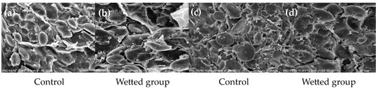 Scanning electron micrographs of transverse sections of (a) Jokyoung control, (b) Jokyoung wetted, (c) Hwanggeumal control, and (d) Hwanggeumal wetted. Wheat grains harvested without rain exposure exhibited intact starch granules embedded within a highly dense protein matrix. In the wetted group, however, the starch granules and protein matrix began to break down, leading to the hydrolysis of A- and B-granules and resulting in increased pore formation.