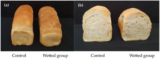 Comparison of (a) exterior and (b) cross-sections of the loaves produced with control and water-treated ‘Jokyoung’ wheat grains.