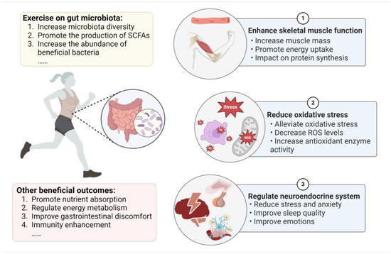 Physical exercise is an important means to promote health and chronic disease management and can exert a positive impact on the body through energy metabolism, inflammatory response, and oxidative stress [23]. Moreover, moderate exercise exerts positive effects on gut physiology health, such as by promoting gastrointestinal peristalsis to relieve constipation and accelerating blood circulation in the gastrointestinal tract [24]. Studies have confirmed that exercise can affect the diversity, composition, and relative abundance of the gut microbiota [7,25]. Furthermore, there are reciprocal effects between the gut microbiota and exercise. Exercise-related alterations in the gut microbiota and microbial metabolite variations have also been reported, indicating that the gut microbiota may influence the effects of exercise [12,26]. We provide a summary of the connections between exercise and gut health below.