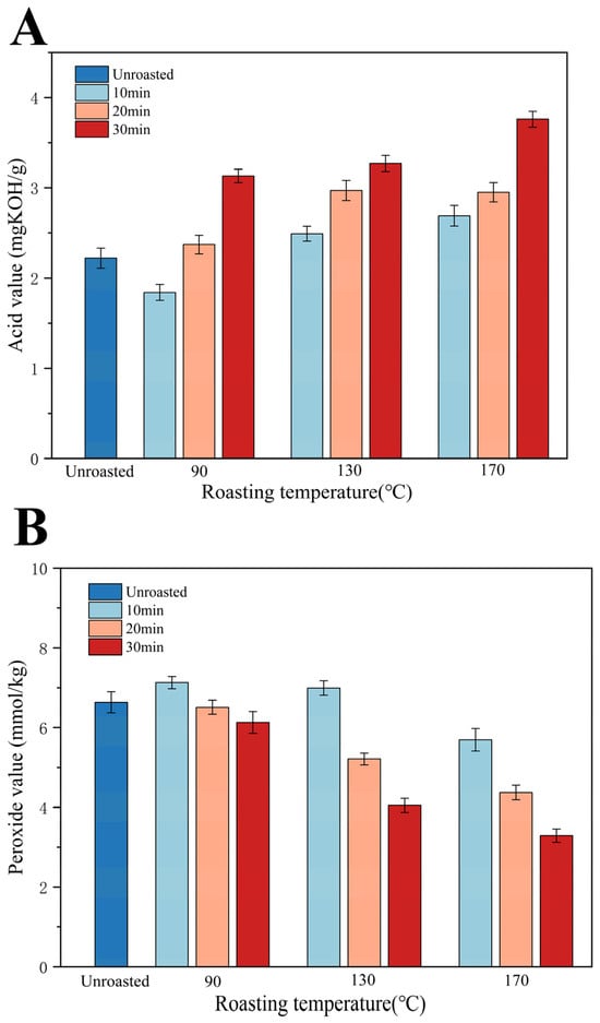 Effect of roasting on the AV (A) and POV (B) of TSO at 90, 130, and 170 °C for 10, 20, and 30 min.
