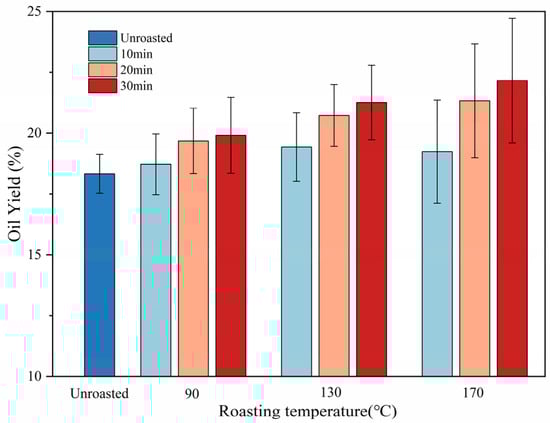 The roasting process resulted in changes in the TSO oil yield, as shown in Figure 2. The oil yield of TSO showed an overall upward trend with increasing roasting temperature and time. The original oil content of the TSO obtained from raw unroasted TS was 18.72%. The percentage of TSO extracted from seeds markedly increased (p < 0.05) as the roasting temperature (up to 170 °C) and time (up to 30 min) were increased, rising from 18.72 to 22.16%. This phenomenon could be attributed to the thermal treatment process, which promoted oil release by decreasing enzyme activity, coagulating proteins, and inducing structural changes [11,16]. In this study, moderate roasting was employed, using different temperature and time parameters from those applied in hot pressing, to investigate how the overall quality of TSO can be improved by moderate roasting.