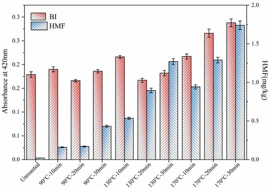 To elucidate the passage of MRPs to the oil phase, the changes in the non-enzyme browning index and HMF, an intermediate formed during thermal processing, were determined [31]. The effects of roasting on the BI and HMF are given in Figure 3. The BI of TSO was gradually increased with an increase in the roasting temperature and time. The highest absorbance at 420 nm was observed in TSO obtained from TS roasted at 170 °C for 30 min. A similar finding has also been observed in wheat germ roasting [29]. Our analysis showed that no HMF was detected in TSO obtained from unroasted TS, and the highest content of HMF (1.74 mg/kg) was observed in TS roasted at 170 °C for 30 min, which indicates that roasting can promote the production of MRPs of TSO. The BI exhibited a positive correlation with HMF and can be regarded as an indicator of the severity of a heat treatment process for various foods.