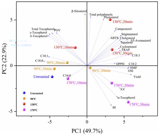 Multivariate analysis was conducted using IBM SPSS Statistics 25 software to identify the correlations among the various physicochemical properties, tocopherol, phytosterols, oxidative stability, antioxidant activity, FAC, and MRPs of TSO obtained from unroasted and roasted TS. A total of twenty-seven variables, with three replicates (n = 3) were included in our statistical evaluation. The loading plot of the first two components for TSO obtained from roasted seeds is presented in Figure 4. The first two principal components account for 73.11% (principal component 1 = 49.74%, principal component 2 = 23.37%) of the total variation. According to our PCA results, TSO obtained after roasting at 130 °C for 20 min showed the most significant alteration. As shown in Table 4, principal component 1 showed positive loadings mainly with the OSI, oil yield, and HMF. The predominantly contributing components of principal component 2 were β-sitosterol, total polyphenols, and phytosterol. Interestingly, the results of PCA analysis showed that the first principal component was closely linked to HMF and that a high concentration of HMF was not an indication of good oil quality. This phenomenon might be due to the accumulation of HMF with the increase in roasting time and temperature. However, in combination with Figure 3, the HMF content contained in TSOs baked at 90, 130, and 170 °C for 10, 20, and 30 min, respectively, showed a generally low level (HMF < 5.0 mg/kg). Therefore, this did not affect the results obtained by PCA.