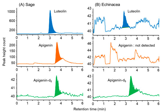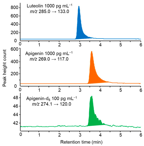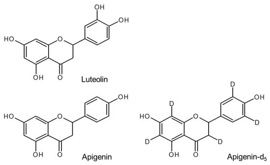 Luteolin and apigenin were procured from Tokyo Kasei Kogyo (Tokyo, Japan), while stable isotope-labeled apigenin-d5 (98% isotope purity) was obtained from Toronto Research Chemicals Inc. (TRC, North York, ON, Canada) and utilized as the internal standard (IS) (Figure 1). These standards and the IS were dissolved in LC–MS-grade methanol (Kanto Chemicals, Tokyo, Japan) to create a 1 mg mL−1 solution, securely capped and stably stored at 4 °C. Prior to use, working standard solutions were prepared by diluting these stock solutions with LC–MS-grade distilled water (Kanto Chemical) to obtain a concentration of 10 ng mL−1 each for luteolin and apigenin, and 1 ng mL−1 for the IS. LC–MS-grade acetonitrile (Kanto Chemicals), distilled water, and formic acid (Wako Pure Chemicals) served as mobile phases, while all other reagents were of analytical grade.