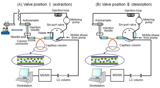 Schematic diagram of the improved IT-SPME LC-MS/MS system used in this study. (A) Adsorption of compound on stationary phase in capillary column, (B) desorption of compound by mobile phase solvent.