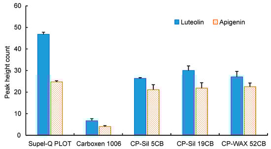 Effects of capillary coatings on IT-SPME of luteolin and apigenin. For each capillary column, 40 µL of a 100 pg mL−1 standard solution was repeatedly injected 5 times.