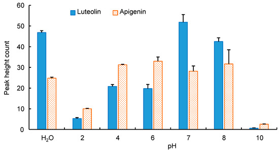 Effects of pH of sample solution on IT-SPME of luteolin and apigenin. For each pH, 40 µL of a 100 pg mL−1 standard solution was repeatedly injected 5 times.