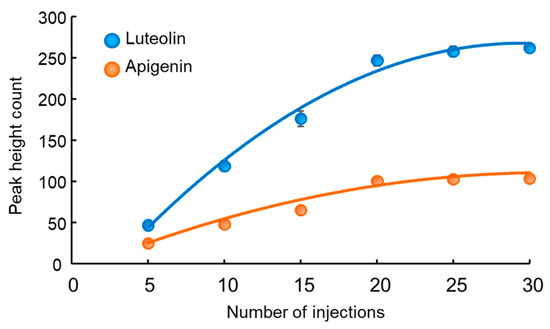 Effects of number of sample injections on IT-SPME of luteolin and apigenin. For each injection number, 40 µL of a 100 pg mL−1 standard solution was repeatedly injected.