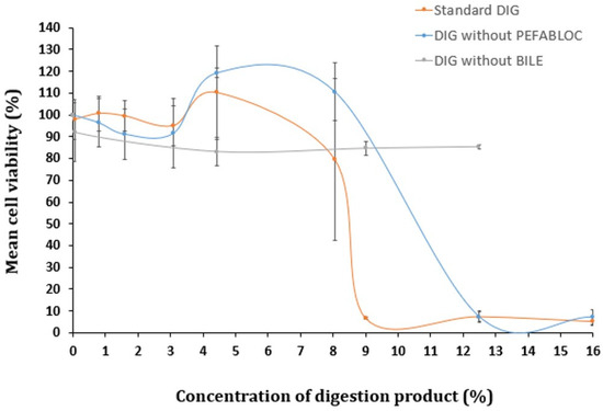 Cell viability of Caco-2 cells undergoing a 24 h exposure to a concentration gradient (%) of digestion product, using the standard in vitro digestion protocol (DIG) or lacking (i) Pefabloc® SC or (ii) bovine bile in its composition, determined by the MTT assay. Results are presented as relative viability (mean ± standard deviation; N > 3).