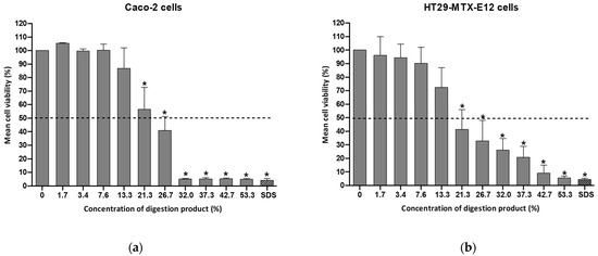 Cell viability of (a) Caco-2 cells or (b) HT29-MTX-E12 cells, after 24 h exposure to different concentrations of digestion product (0–14%) using the MTT assay. Results are presented as relative viability (mean ± standard deviation, N = 3). *—p < 0.0001, One-Way ANOVA, Post Hoc Dunnett’s Multiple Comparison Test. Dashed line indicates 50% viability.