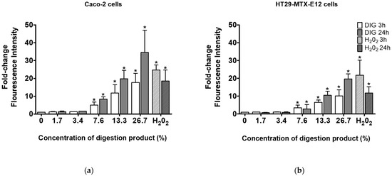 ROS generation in (a) Caco-2 cells or (b) HT29-MTX-E12 cells, after 3 and 24 h exposure to different concentrations (0–26.7%) of modified digestion product, using 4 mM bile (0: negative control, medium only). *—Significantly different from the negative control (p < 0.05, Student’s t-test).