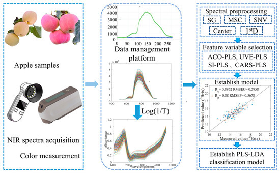 The purpose of this study is to model the dynamic nondestructive detection of apples on trees during the harvesting period after the removal of apple bags. The technical approach is depicted in Figure 1. The specific objectives are to (1) compare and analyze the change rules of the apple surface coloring and brix on the tree during the harvesting period and establish a mechanism linking near-infrared spectroscopy and different maturity levels; (2) analyze and compare the optimization results of reflectance spectral feature algorithms for two maturity levels of apples before and after the harvesting period, to provide a recommended solution for the dynamic quality inspection of apples; and (3) study the effect of color parameters (L*, a*, b*) on the modeling of the dynamic change process. A classification model was built with PLS-LDA.