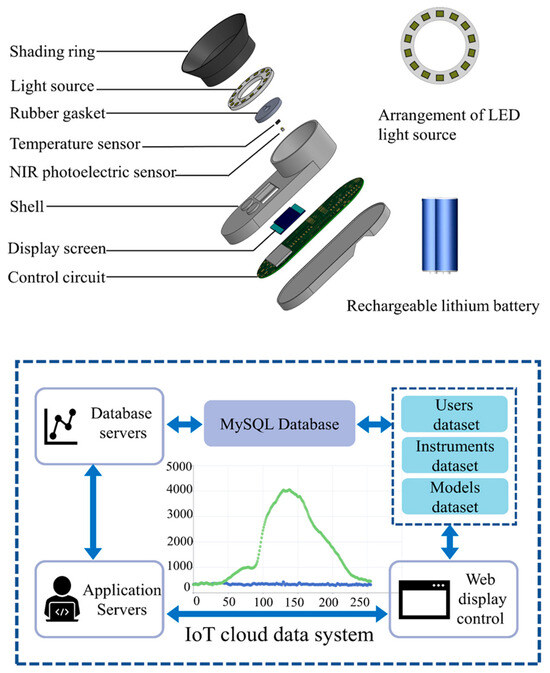 The internal quality of a sample can be detected using the apple internal quality handheld tester. As shown in Figure 2, the apple internal quality handheld tester and an Internet of Things (IoT) cloud data system comprise the detector. When testing, the apple internal quality handheld tester can acquire the reflectance spectrum information of the apple. At the same time, the data are transferred to the IoT cloud data system via a communication module. In the Internet of Things (IoT) cloud data system, the model of the inspection is used for calculation and can predict the inspection results. Data can also be queried, downloaded, and statistically analyzed in the detection database.