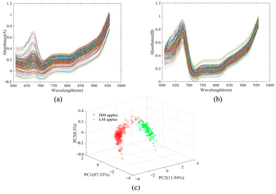 Spectral analysis of apple samples. (a) Spectrum of LM apples, (b) spectrum of HM apples, (c) PCA scatter plot of LM apples (green +) and HM apples (red ○).