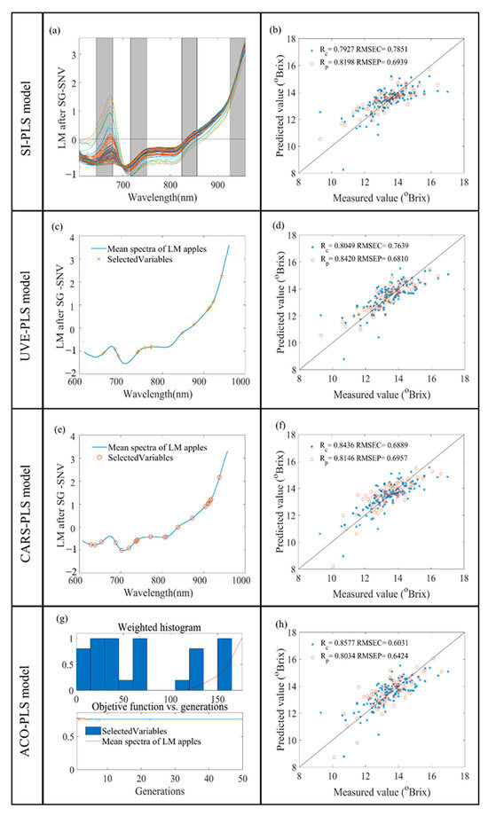 As shown in Table 4, the best performance was seen for the reflectance spectra of highly mature apples combined with the SG-SNV preprocessing model, with Rp, RMSEP, and RPD values of 0.8350, 0.7876 °Brix, and 1.778. Therefore, SG-SNV was chosen as the preprocessing method before feature selection for the reflectance spectra. In the low-maturity apples’ reflectance spectra, the SG-SNV method did not have as high an RPD value as SG-1stD, but it was also chosen for preprocessing in order to control the variables to obtain a good model of the reflectance spectra.