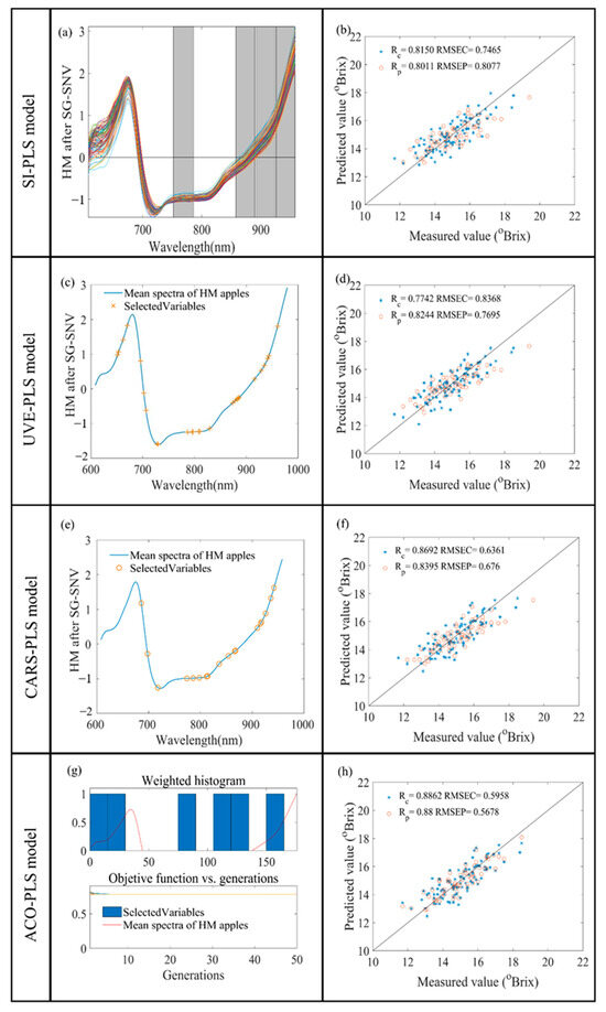 The characteristic wavelength points were extracted from the full spectrum using the ACO algorithm. The control parameters of the ACO optimization algorithm were verified by several experiments, as follows: the initial population size was 100, the maximum number of iterations was 50, the maximum number of loops was 10, the probability threshold of variable selection was 0.3, and the significance factor Q was 0.01. The pheromone attenuation coefficient p was 0.65, which reliably ensured the comprehensiveness of the transmitted information and the convergence speed of the algorithm. The selected wavelength variables are shown in Figure 4g and Figure 5g, and the established models for Rc, RMSEC, Rp, and RMSEP are shown in Figure 4h and Figure 5h. The RPD values of the reflectance spectral models for low- and high-maturity apples were 1.868 and 2.466. ACO-PLS achieved the best results in the reflectance spectral modeling of apples at both maturity levels.