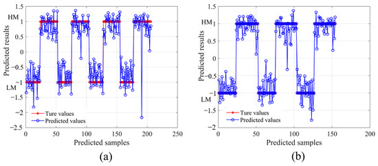 PLS-LDA modeling results with color space coordinates (L*, a*, b*) as input variables, true values (*), and predicted values (○). Comparison of prediction results of training set (a) with 99.03% accuracy and comparison of prediction results of prediction set (b) with 99.53% accuracy.