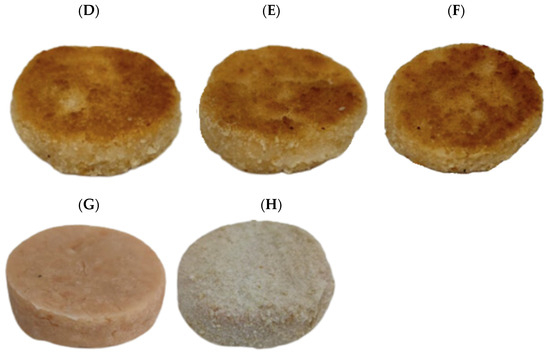 Photography of raw, fried, and baked nuggets. (A) BN: baked nugget control; (B) BN1: baked nugget + 0.75% BF/PH (1:1); (C) BN2: baked nugget + 1.25% BF/PH (1:1); (D) FN: fried nugget control; (E) FN1: fried nugget + 0.75% BF/PH (1:1); (F) FN2: fried nugget + 1.25% BF/PH (1:1); (G) raw nugget; (H) breaded raw nugget.