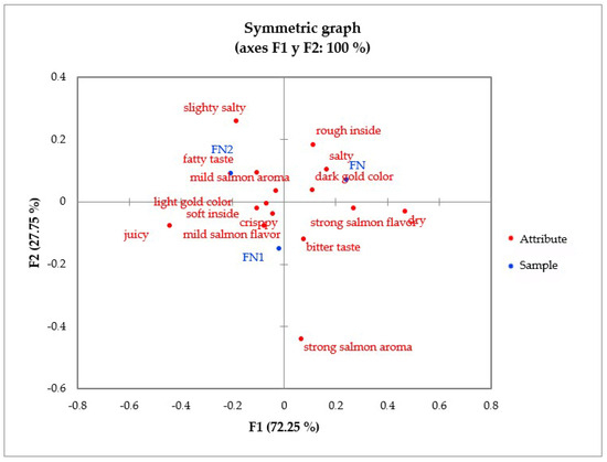 Regarding the fried salmon nugget, in Figure 4, it can be seen that consumers characterized the control sample (FN) by a dark golden color, salty flavor, and rough inside; the nugget with 0.75% BF/PH (FN1) for a mild salmon flavor, crispy texture, juiciness, soft inside, and light gold color; and those with 1.25% BF/PH (FN2) were evaluated with a mild salmon aroma, fatty and slightly salty flavor, and light gold color. However, according to the Q analysis (Table 6), it was observed that only in the juicy and dry attributes were significant differences found between FN, FN1, and FN2. The juicy attribute was more representative of the FN2 sample, while the dry attribute was representative of the FN sample. The remaining attributes did not show significant differences between the samples. Furthermore, Table 6 shows that the attributes most considered in all samples to describe the fried nugget were crispy texture, light golden color, weak salmon aroma, and soft interior.