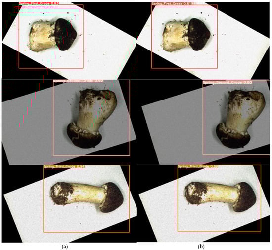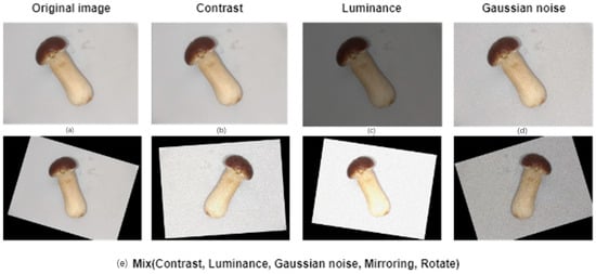 This paper focuses on Stropharia rugoso-annulata, and the accompanying images were obtained from the experimental base of the Research Institute of Pinggu District, Beijing. The images were captured using an MV-UBD130C industrial camera (MindVision, Shenzhen, China) with a spatial resolution of 1280 × 960, a frame rate of 35 FPS, a 4-megapixel lens, a 6 mm focal length, and a 20 cm distance from the target, taken between 12:00 and 16:00 h. A total of 2032 images of Stropharia rugoso-annulata, of varying grades, were collected during the spring and fall under identical light and background conditions. These images were then divided into a training set, validation set, and test set in an 8:1:1 ratio. Table 1 outlines the classification rules for heather, while Figure 1 displays images of heather of different grades during both seasons. The images were labeled manually using the image annotation tool ‘Labelme 4.5.13’, and the groups of the same grade images were labeled using external rectangular boxes. To avoid overfitting problems caused by an insufficient number of images in the dataset and to improve the generalization ability and robustness of the deep learning network, a total of 6490 images were obtained by rotating, adding noise, adjusting brightness, and performing other image enhancement operations on the original images in each dataset. The dataset was enhanced for network model training, as shown in Table 2. The effect of the enhancement is illustrated in Figure 2.