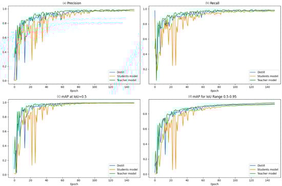 Comparison of metrics in models (student model, teacher model, distilled student model) related to knowledge distillation: (a) Precision curve. (b) Recall curve. (c) mAP@ 0.5 curve. (d) mAP@ 0.5:0.95 curve.