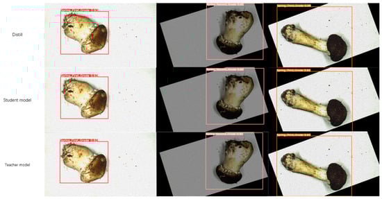 YOLOv8 is a cutting-edge, state-of-the-art (SOTA) model. It can perform a variety of object detection tasks quickly, accurately and easily. Different models are provided for different application scenarios, including YOLOv8n, YOLOv8s, YOLOv8l, YOLOv8x and YOLOv8m, which differ only in depth and width. In practice, Stropharia rugoso-annulata are graded in order to achieve just-in-time sorting, and therefore, the model sizes are required to be sufficiently small and the detection speeds are sufficiently fast to be able to adapt to the deployment of intelligent machinery. Therefore, after comprehensive consideration, YOLOv8n was finally selected as the base model for the student model and YOLOv8s as the base model for the teacher model. Comparison of the training results for different models of YOLOv8 is shown in Table 4.