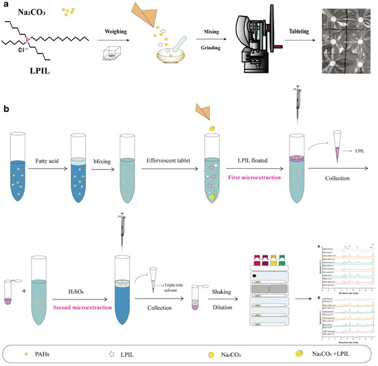 - Jing, Q.; Chen, L.; Zhao, Q.; Zhou, P.; Li, Y.; Wang, H.; Wang, X. Effervescence-assisted dual microextraction of PAHs in edible oils using lighter-than-water phosphonium-based ionic liquids and switchable hydrophilic/hydrophobic fatty acids. Anal. Bioanal. Chem. 2021, 413, 1983–1997. [Google Scholar] [CrossRef]