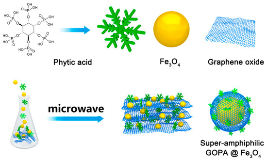 Schematic for the preparation of super-amphiphilic GOPA@ Fe3O4. Adapted from [62], with permission from W. Ji, 2017.