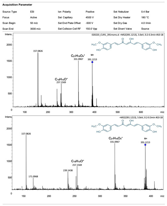 The ESI-Q-TOF mass spectrum of the turmeric ethanolic extract is presented in Figure 1. The spectrum shows the expected M+ ion of curcumin (m/z 391) and other fragment ion peaks of curcumin, C21H16O4+ (m/z 331) and C19H11O+ (m/z 257). The quantitative analysis showed that the ethanolic extract of concentrated turmeric contained approximately 1.5% of curcumin.