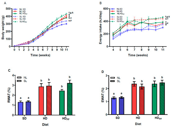Homeostatic energy balance: (A) body weight, (B) energy intake, (C) retroperitoneal white adipose tissue weight (RWAT), and (D) epididymal white adipose tissue weight (EWAT). Data are expressed as mean ± standard error, n = 6–8 in each group. In (A,B), for a–g, p < 0.05 between groups within the same week (W): a, NLHD vs. NLSD W4 and W9–W11 on (A), W4 and W9–W11 on (B); b, NLHDFF vs. NLSD W9–W11 on (B); c, NLHDFF vs. NLHD W11 on (A,B); d, SLHD vs. SLSD W10 and W11 on (A), W4–W11 on (B); e, SLHDFF vs. SLSD W10–W11 on (A,B); f, SLHDFF vs. SLHD W11 on (A,B); g, SLHDFF vs. SLHD W11 on (A,B). #, SLSD vs. NLSD W4 and W9–W11 on (A,B); +, SLHD vs. NLHD W9–W11 on (B); and &, SLHDFF vs. NLHDFF W4 and W9–W11 on (A) and W7 and W9–W11 on (B). Different literals mean a significant difference (p < 0.05) between diets on (C,D). NL = normal litter; SL = small litter; SD = standard diet; HD = hypercaloric diet; HDFF = hypercaloric diet with functional food.