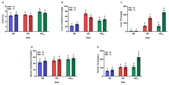 Lipid metabolism: (A) relative liver weight (%), (B) liver cholesterol, (C) liver triglycerides (TG), (D) serum cholesterol and (E) serum triglycerides (TG). Data are expressed as mean ± standard error, n = 6–8 in each group. Different literals mean a significant difference (p < 0.05) between groups.