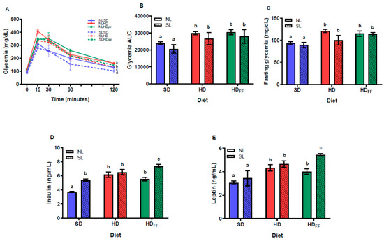Glucose homeostasis: (A) glycemia during the IP glucose tolerance test, (B) area under the curve (AUC) of glycemia, (C) fasting glycemia, (D) insulin serum levels, and (E) leptin serum levels. Data are expressed as mean ± standard error, n = 6–8 in each group. In (A), for a, b, c, and d, p < 0.05 between groups within the same time (t): (a), SLSD vs. NLSD t60–t120; (b), SLHD vs. NLHD t0 and t120; (c), NLHD vs. NLSD t0, t30 and t120; d, SLHD vs. SLSD t120. Different literals mean a significant difference (p < 0.05) between groups (B–E).