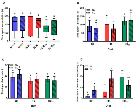 Locomotive behavior in open field: (A) time spent in ambulation, (B) time spent resting, (C) number of rearing events, and (D) time spent in non-ambulatory activity. Data are expressed as median and minimum to maximum points (A) and mean ± standard error (B–D); n = 6–8 in each group. Different literals mean a significant difference (p < 0.05) between groups.