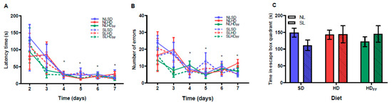 Memory and learning test on Barnes maze: (A) latency time, (B) number of errors, and (C) time spent in the escape box quadrant. Data are expressed as mean ± standard error; n = 6–8 in each group. * p < 0.05, the main significant differences with respect to days 2 and 3 on (A,B). (C) No significant differences were found.