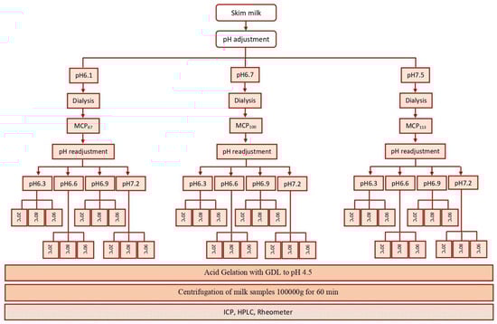 Acid gelation of unheated and heated pH-adjusted MCP-adjusted skim milk samples was conducted by adding glucono-delta-lactone (GDL) and then incubating the mixture at 30 °C. As the buffering capacity of the milk was altered by changing the MCP levels and pH, the GDL level was varied so that a pH of 4.5 was achieved within a selected time frame; therefore, this GDL amount was established pre-experiments and a pre-determined amount of GDL was added [33]. Incubation was stopped when pH reached 4.5. The experimental design of this study is depicted in Figure 1.
