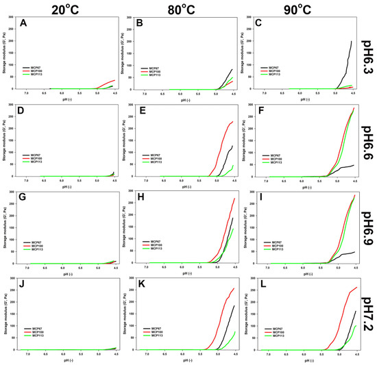 As shown in Figure 2, the unheated samples gelled less strongly in comparison to the heated samples. The evolution of G′ during acidification was affected by the MCP content, the adjusted pH, and the extent of heat treatment. The acid-induced gels produced by MCP100 appeared to have the highest G′. The gel formation of samples MCP100 and MCP113 was greatly affected at pH 6.3 compared to other pH levels before and after heating. Interestingly, when MCP100 was heated at 90 °C with low pH, it formed a gel with a G′ even lower than the sample acidified after heating at 80 °C. After heating at 80 °C, the MCP67 samples produced a gel with an appreciable high G′, which was lower than that of the control but greater than that of MCP113. The reverse was observed when samples had a pH of 6.6 or 6.9, with MCP67 showing impaired gelling behaviour compared to other MCP levels and even to the same MCP level heated at 80 °C (Figure 2E,F,H,I). Gel-forming ability improved somewhat when the pH was adjusted to 6.3 or 7.2 (Figure 2C,L).