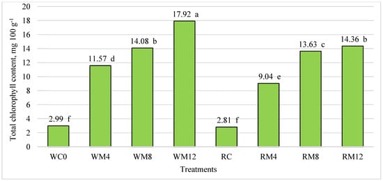 Influence of mulberry leaf additive on the total chlorophyll content of butter cookies, mg 100 g−1. The differences between the means not marked by the same letter (a, b, c, d, e, f) are significant at p ≤ 0.05. WC—wheat flour cookies without mulberry leaf additive (control), WM4—wheat flour cookies with 4% mulberry leaf additive, WM8—wheat flour cookies with 8% mulberry leaf additive, WM12—wheat flour cookies with 12% mulberry leaf additive, RC—rice cookies without mulberry leaf additive (control), RM4—rice flour cookies with 4% mulberry leaf additive, RM8—rice flour cookies with 8% mulberry leaf additive, RM12—rice flour cookies with 12% mulberry leaf additive.