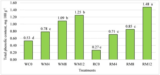 Influence of mulberry leaf additive on the total phenolic content of butter cookies, mg 100 g−1. The differences between the means not marked by the same letter (a, b, c, d, e) are significant at p ≤ 0.05. WC—wheat flour cookies without mulberry leaf additive (control), WM4—wheat flour cookies with 4% mulberry leaf additive, WM8—wheat flour cookies with 8% mulberry leaf additive, WM12—wheat flour cookies with 12% mulberry leaf additive, RC—rice cookies without mulberry leaf additive (control), RM4—rice flour cookies with 4% mulberry leaf additive, RM8—rice flour cookies with 8% mulberry leaf additive, RM12—rice flour cookies with 12% mulberry leaf additive.