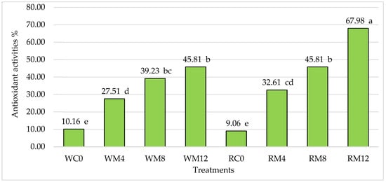 Influence of mulberry leaf additives on antioxidant activities in butter cookies, %. Note: The differences between the means not marked by the same letter (a, b, c, d, e) are significant at p ≤ 0.05. WC—wheat flour cookies without mulberry leaf additive (control), WM4—wheat flour cookies with 4% mulberry leaf additive, WM8—wheat flour cookies with 8% mulberry leaf additive, WM12—wheat flour cookies with 12% mulberry leaf additive, RC—rice cookies without mulberry leaf additive (control), RM4—rice flour cookies with 4% mulberry leaf additive, RM8—rice flour cookies with 8% mulberry leaf additive, RM12—rice flour cookies with 12% mulberry leaf additive.