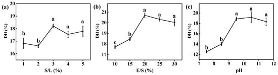 Effect of (a) S/L, (b) E/S, and (c) pH on DH during hydrolysis of CV protein by free Alcalase. Reaction conditions: (a) temperature = 50 °C, time = 2 h, pH = 9.5 (deionized water), and E/S = 20%. (b) temperature = 50 °C, time = 2 h, pH = 9.5 (deionized water), and S/L = 3%. (c) temperature = 50 °C, time = 2 h, S/L = 3%, and E/S = 20%. Different letters indicate significant differences (p < 0.05) in the same column.
